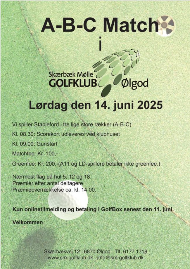 A-B-C Match – 14. juni i Skærbæk Mølle Golfklub Tilmeld dig årets A-B-C Match og vær med til en hyggelig og spændende golfdag i Skærbæk Mølle Golfklub Ølgod! Dato: Fredag den 14. juni Scorekort udleveres: Kl. 8.00 Gunstart: Kl. 9.00 Matchfee: 100 kr. Greenfee: 200 kr. (for gæster) Der spilles stableford i 3 lige store…